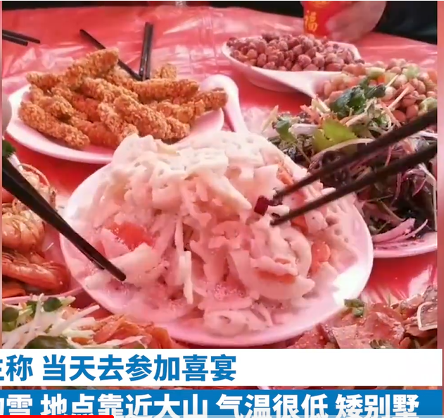从视频中能看到,一盘凉拌的莲藕已被冻成了“冰雕”,莲藕上面还有一层冰霜,众人用筷子夹不动、扒拉几下也没弄开。其它几个菜也是如此,都冻得硬梆梆的。无从下嘴,大家都在那里笑,后来菜都被大家打包带走了。